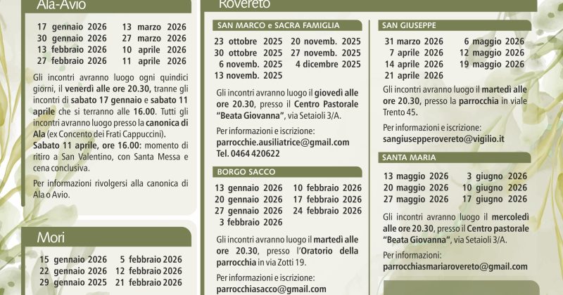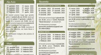 PREFESTIVE 17.00 S. Famiglia – Lizzana (Centro Pastorale) 18.00 S. Croce – Besenello – Vallarsa (a rotazione tra le varie parrocchie) – Castellano – Marano... Leggi tutto